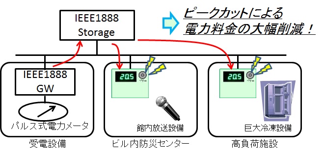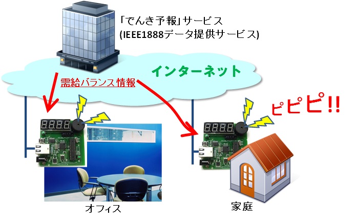 | 電力消費量(電力使用率)を、インターネット上のIEEE1888サーバから取得し、見やすいLEDディスプレイに表示します。数値が規定値を超えると、警報音が鳴り、周囲の人々に警戒(&節電)を呼びかけます。警報レベルは3段階で指定できます。警報レベルに応じて、警報音やディスプレイの点滅方法が変わります。 |
